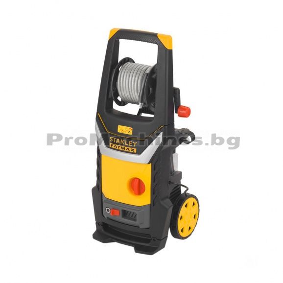 Електрическа водоструйка Stanley SXFPW25E с индукционен двигател с мощност 2500W. Машината има налягане 150 bar и дебит 450 л/ч. Моделът може да се захранва с вода както от водопроводната мрежа, така и от друг водоизточник. Помпата на уреда е изработена от месингова сплав и е устойчива на висока температура и високо налягане. Маркучът на барабана е свързан директно към водата под налягане. Машината е с вграден резервоар за перилен препарат.