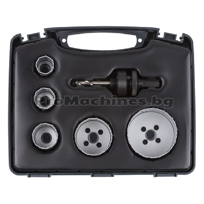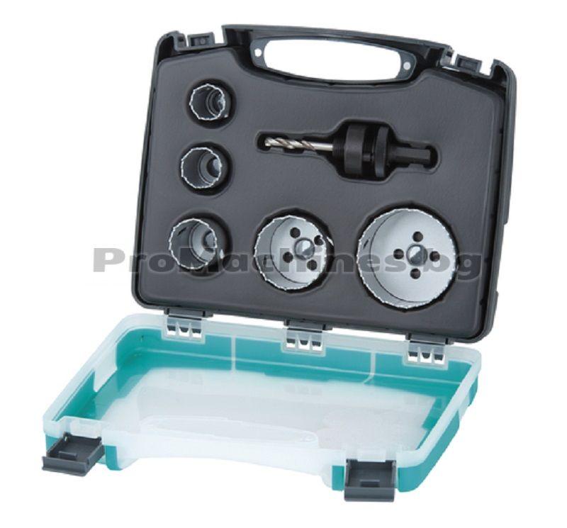 • Оборудване: 5 броя боркорони BiM с диаметър 25, 29, 35, 51 и 68мм. и 1 брой дорник с центриращо свредло HSS